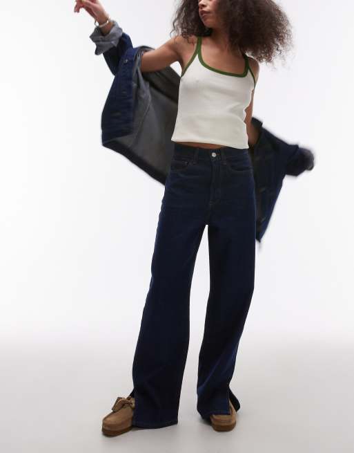 Topshop – Indigoblå, tvättade jeans med slits framtill, medelhög midja och ledig passform