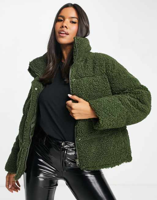 Topshop – Kakifärgad pufferjacka av teddy i midilängd