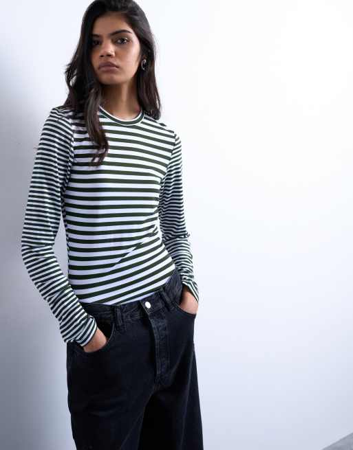 Topshop – Kakifärgad, randig topp med kontrast baktill och långa ärmar