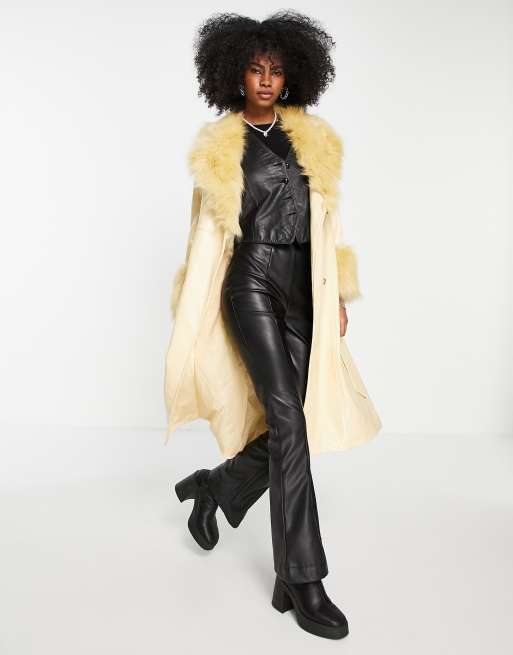 Topshop – Kärnmjölksgul, lång kappa med skärp av PU och fuskpäls