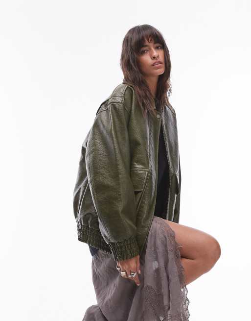 Topshop – Khakifärgad bomberjacka i läderimitation och oversize