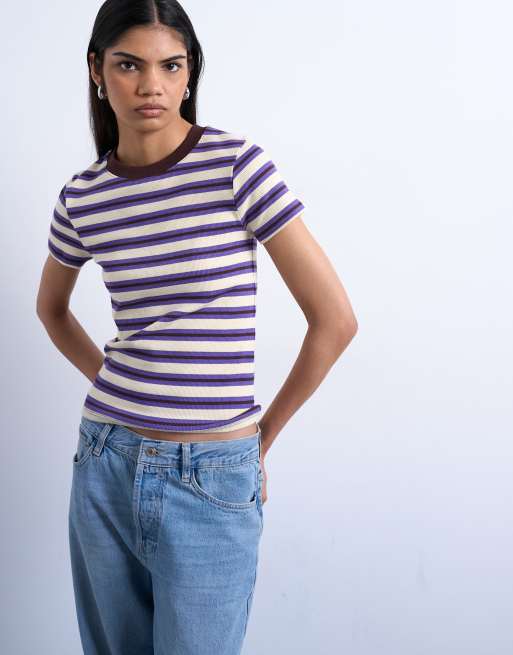 Topshop – Lilarandig, ribbad t-shirt med korta ärmar