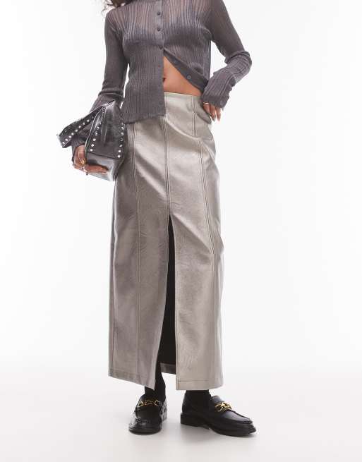 Topshop – Metallgrå midikjol i läderimitation med slits