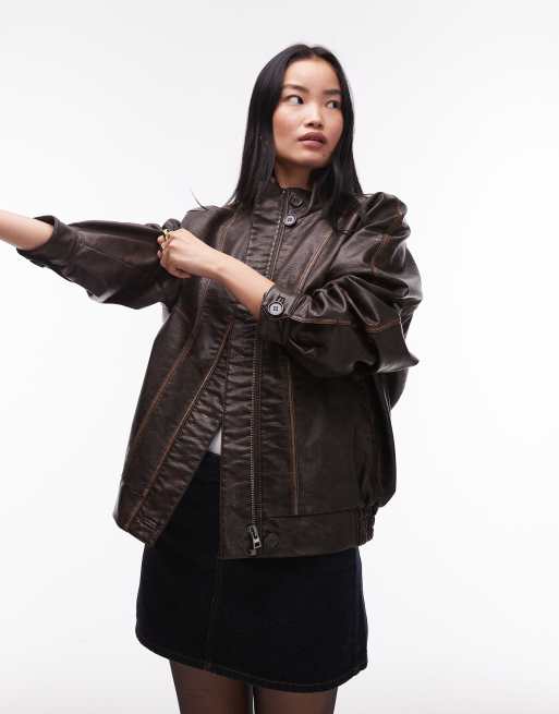 Topshop – Mörkbrun bomberjacka i läderimitation och oversize