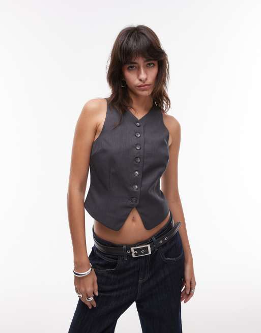 Topshop – Mörkgrå, kort kostymväst med hög ringning