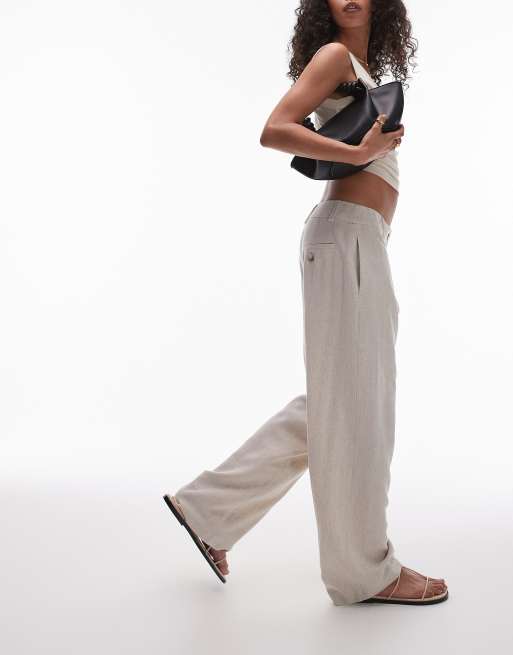Topshop – Naturfärgade linnebyxor med låg midja och knapp
