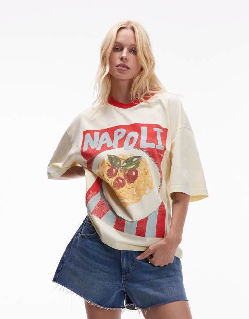 Topshop – Naturvit t-shirt i oversize med 'Napoli'-tryck och kontrastfärgade kantränder