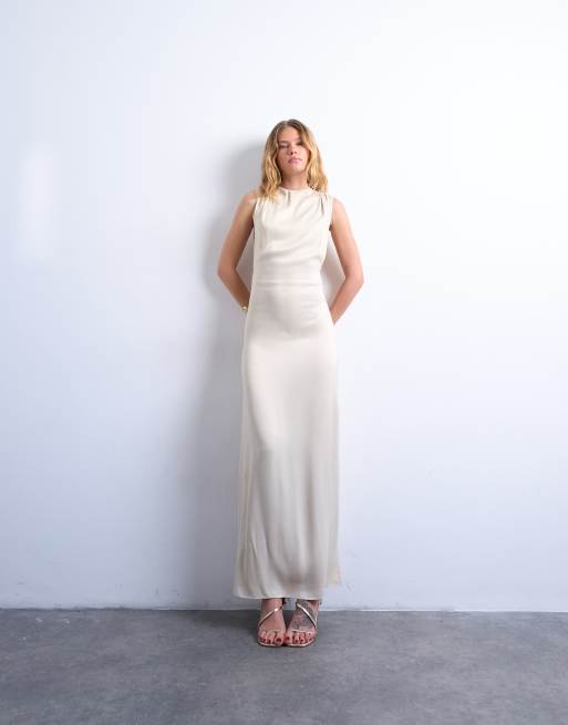 Topshop – Ostronvit, lång högtidsklänning med djupa ärmhål