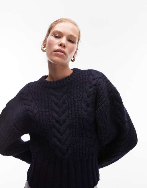 Topshop – Premium – Marinblå, flätstickad tröja med rundade ärmar