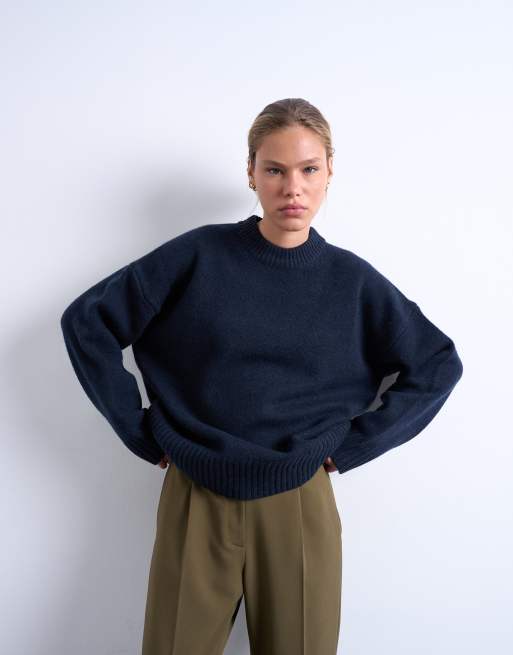 Topshop – Premium – Marinblå, stickad tröja i 100% lammull