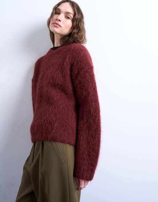 Topshop – Premium – Vinröd, stickad tröja i alpackaull med rund halsringning och boxig passform