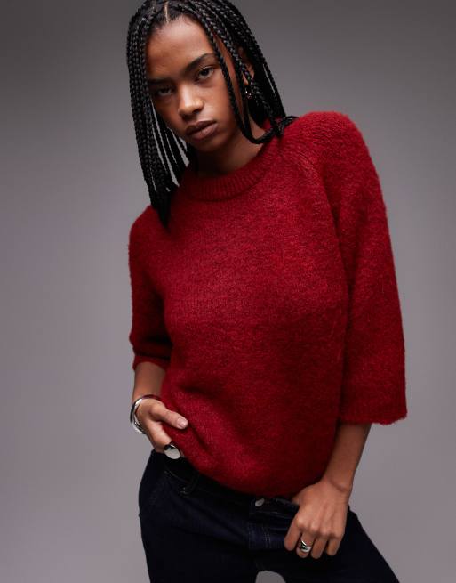 Topshop – Röd, stickad tröja i ylleblandning med halvlånga ärmar