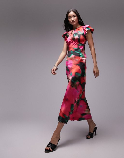 Topshop – Rosa midiklänning med dekorativ söm vid bysten och suddigt blommönster