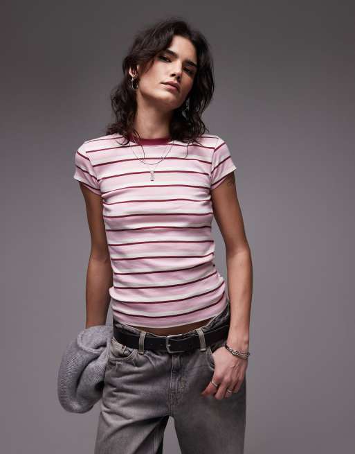 Topshop – Rosa, randig vardaglig t-shirt