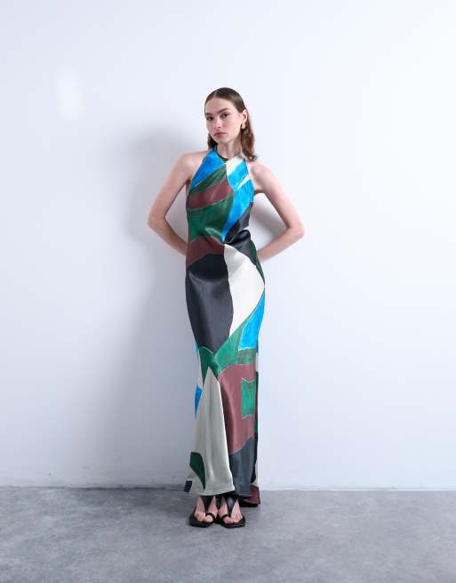 Topshop – Satinklänning med halterneck och abstrakt mönster