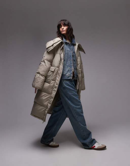 Topshop – Stenfärgad pufferjacka i lång modell med ståkrage