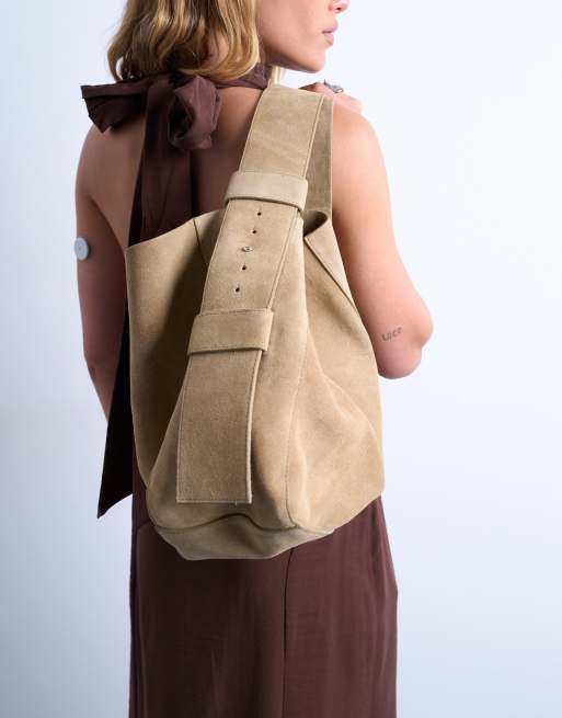 Topshop – Suri – Ljusbrun axelväska i äkta mocka