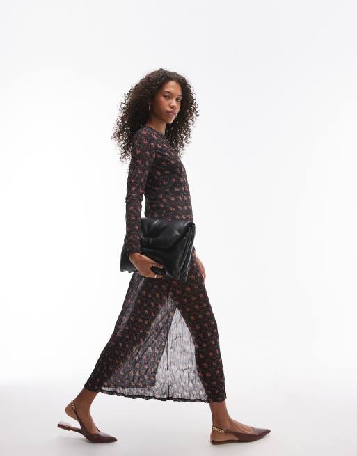 Topshop – Svart och rosa, småblommig, skir, krinklad maxiklänning med rund halsringning