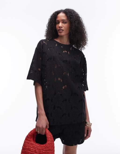 Topshop – Svart t-shirt i oversize av spets, del av set