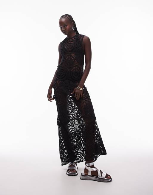Topshop – Svart, virkad och ärmlös midiklänning