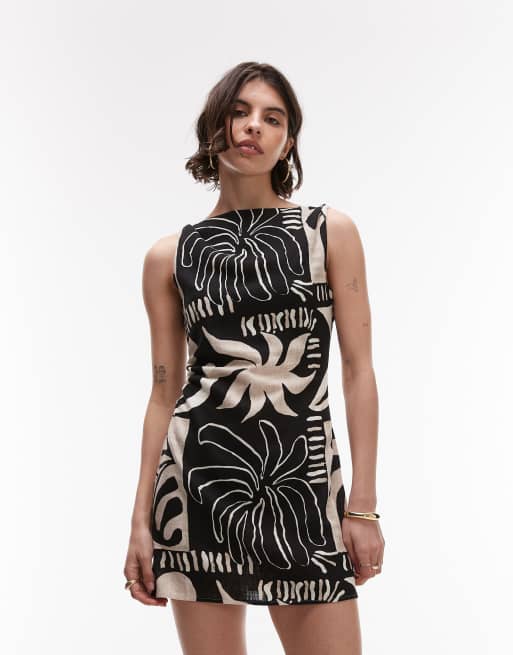 Topshop – Svartvit, abstrakt mönstrad miniklänning med snurrad knut på axeln i linne