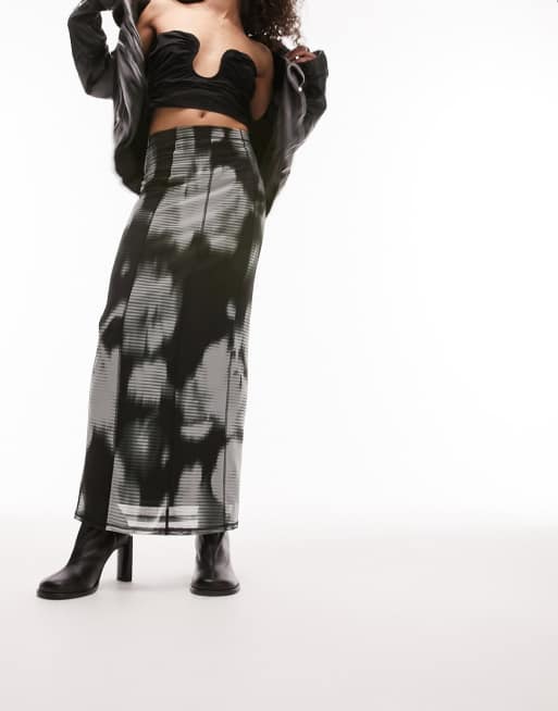 Topshop – Svartvit, suddigt blommig maxikjol i mesh