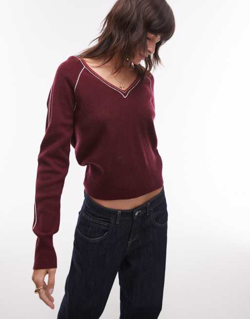 Topshop – Vinröd tröja med v-ringning och kantrand