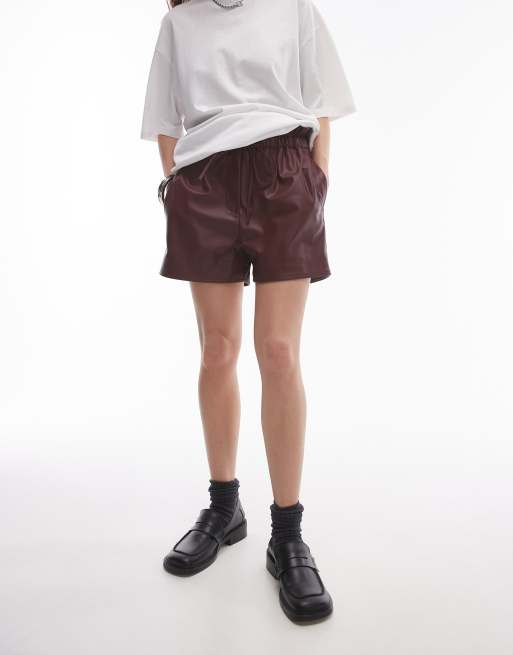 Topshop – Vinröda shorts i läderimitation med paperbag-midja