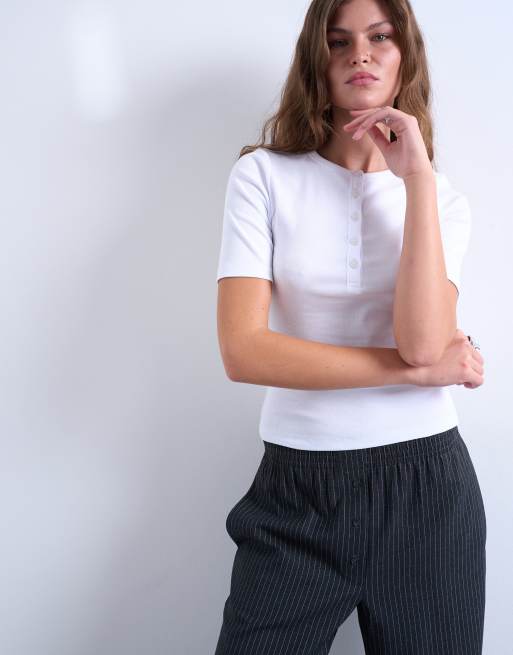 Topshop – Vit, ribbad topp med korta ärmar och knäppning