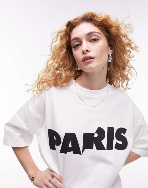 Topshop – Vit t-shirt i oversize med sänkt axelsöm och Paris-tryck