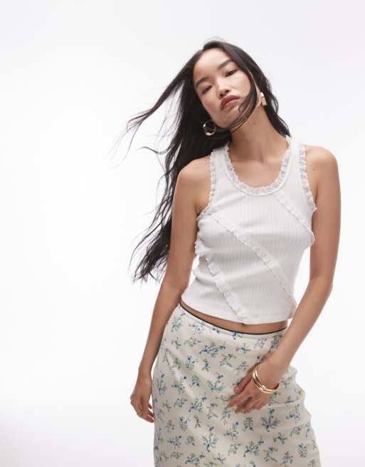 Topshop – Vitt, pointellestickat linne med brottarrygg och volang