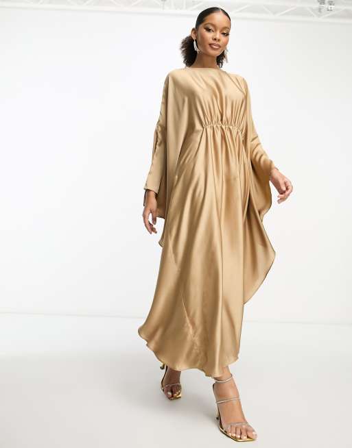 Trendyol – Champagnefärgad, skimrande maxiklänning med cape-ärmar