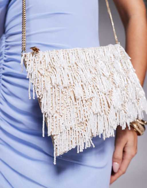 True Decadence – Champagnefärgad kuvertväska med kedjerem och hängande paljetter