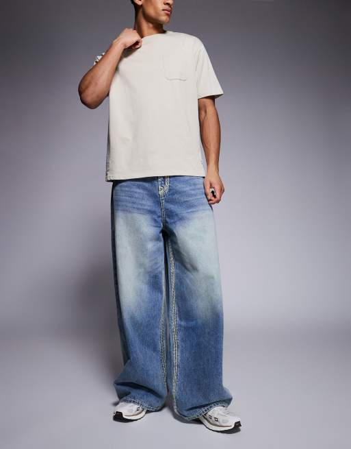 True Religion – Mikey – Blå, tvättade och superbaggy jeans med viklocksfickor