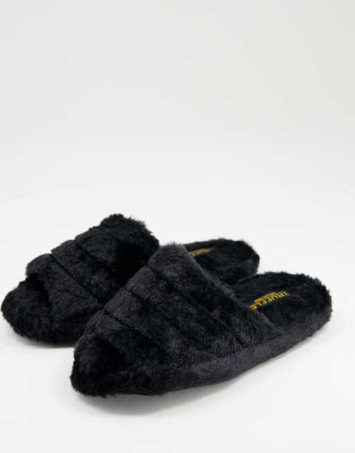 Truffle Collection – Svarta fluffiga tofflor med öppen tå
