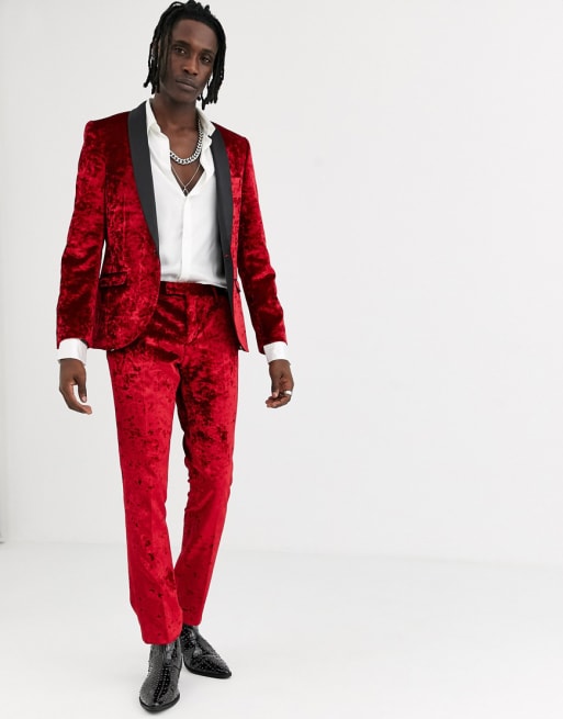Twisted Tailor – Röd kostym i krossad sammet med supersmal passform