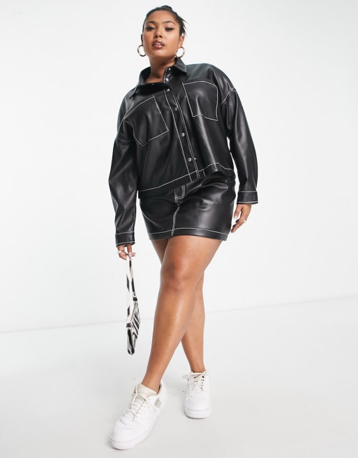 Urban Bliss Plus – Svart, kontraststickat set i PU med skjorta och minikjol