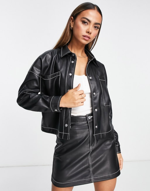 Urban Bliss – Svart, kontraststickat set i PU med skjorta och minikjol