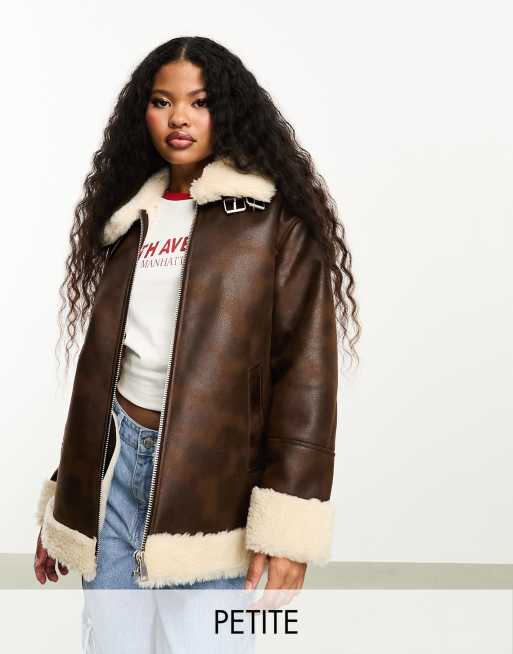 Urbancode Petite – Brun, lång pilotjacka med teddykanter