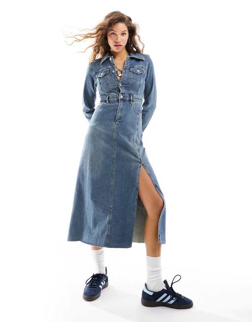Urban Revivo – Maxilång jeansklänning i mellanljus tvätt