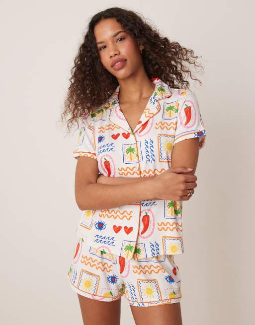 Urban Threads – Pyjamas med kortärmad skjorta med platt krage och shorts med chili- och palmmönster