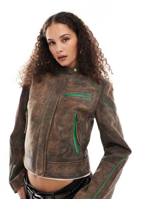 Urbancode – Brun och grön motorjacka i läderimitation med boxig passform