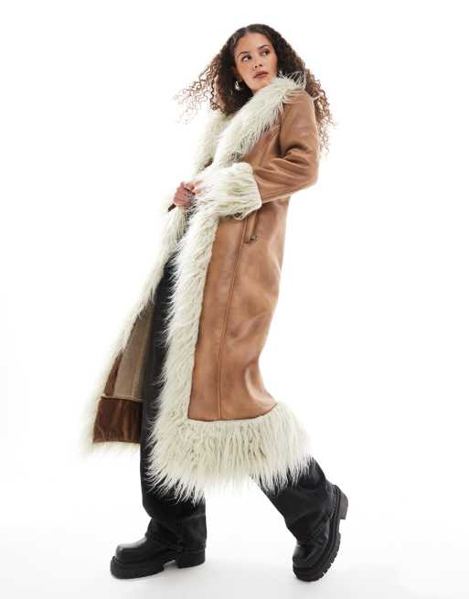 Urbancode – Ljusbrun kappa i maxilängd med fuskpälskanter