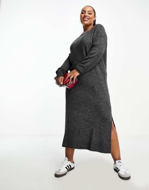Vero Moda Curve – Grå stickad tröjklänning i midilängd