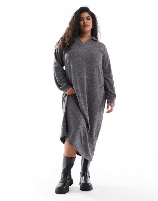 Vero Moda Curve – Mörkgrå, melerad, mjuk, ankellång klänning med pikékrage