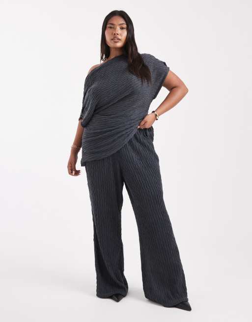 Vero Moda Curve – Mörkgrå, texturerade byxor i jersey med vida ben, del av set