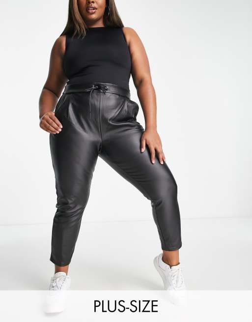 Vero Moda Curve – Svarta mjukisbyxor med knytning i midjan av läderlook