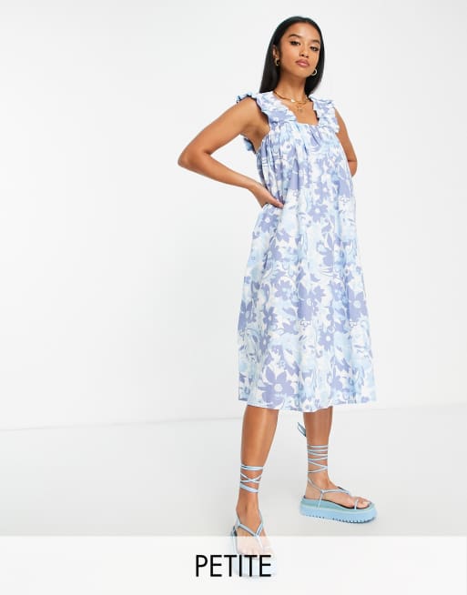 Vero Moda Petite – Blå blommig midiklänning med smockade axelband