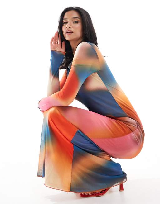 Vero Moda Petite – Blå, långärmad maxiklänning i mesh med solnedgångsmönster