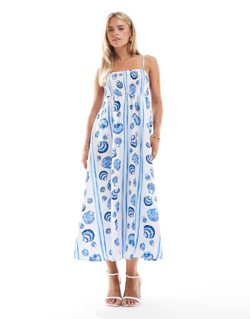 Vero Moda Petite – Blå, snäckmönstrad midiklänning med smala axelband